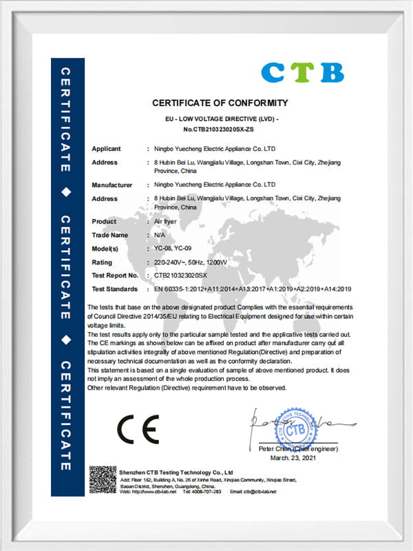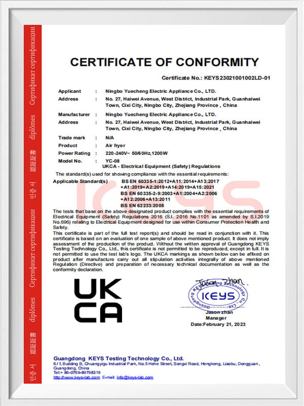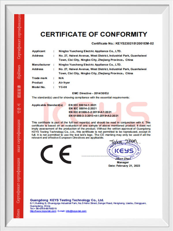 Deimhniú- Ningbo Yuecheng Electric Co., Ltd.